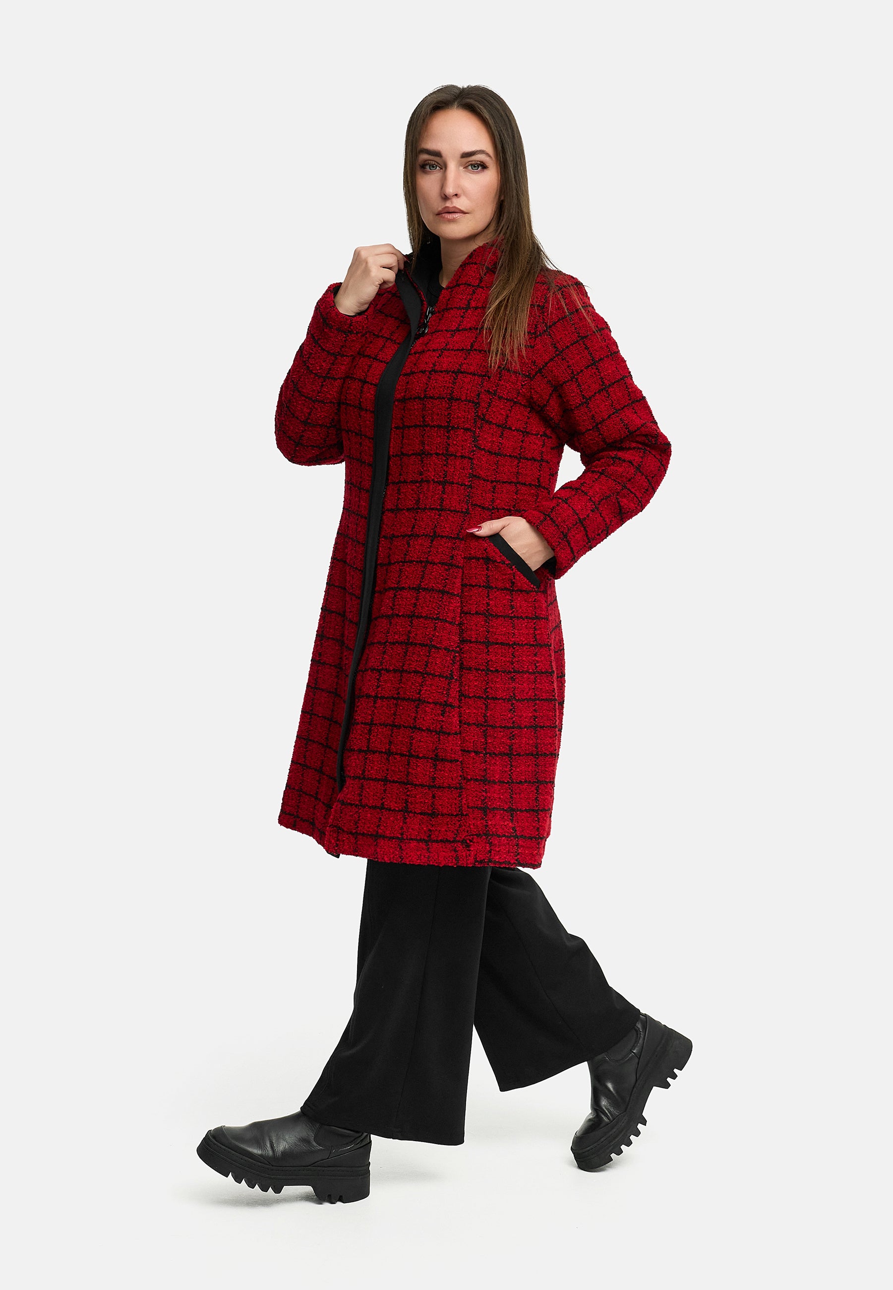Der Festtagsmantel, der sofort Stimmung macht: leuchtendes Rot, kuschelige Bouclé-Struktur und eine Kontrastblende, die dem Look eine klare, moderne Linie gibt – warm gefüttert und trotzdem leicht.